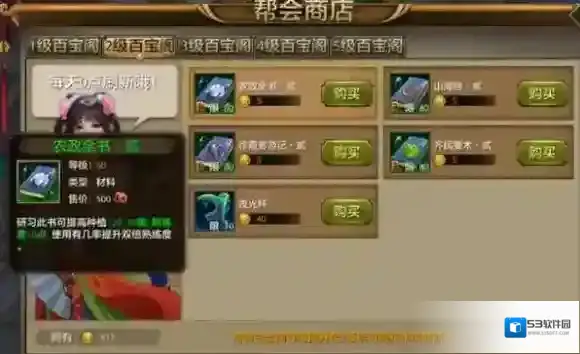 2级帮会商店,可以购买采集技能熟练度提升20-39级的书籍,任务道具夜光杯。
