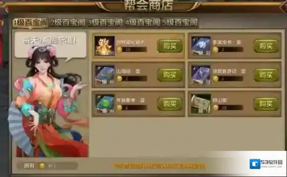 1级帮会商店,可以购买地煞强化精华,采集技能熟练度提升1-19级的书籍,任务道具研山图。