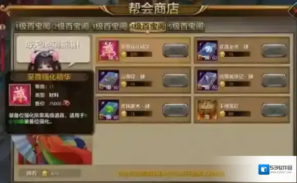 4级帮会商店,可以购买至尊强化精华,采集技能熟练度提升60-79级的书籍,任务道具千佛莲灯。
