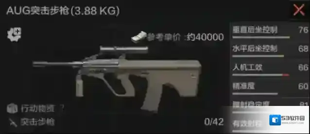AUG是一把在远距离也有不错表现的无托式突击步枪,120米的有效射程在突击步枪中仅次于FAL(124米),60的精准度也相较其他突击步枪更高。自带的1.5倍瞄具的瞄准效果也很不错,很适合中距离作战。AUG的可改装项同样不多,只有瞄具、战术配件和枪口三处。可以考虑将默认瞄具拆下替换成其它倍率更高的瞄具,加装一个镭指加强腰射,最后再加装一个消音器即可完成满改。AUG的几种专用弹匣无法通过联络人获得,需要从市场购买。总的来说和使用同类子弹的F2000各有千秋(AUG射速略慢,精准和有效射程更高),都是起半装时可以考虑的武器。