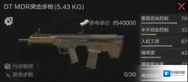 DT MDR是一把入门级的无托式突击步枪,但它的水平后坐控制不太理想,700发/分钟的射速在同样使用5.56毫米口径子弹的一众突击步枪中也不突出。而且DT MDR的改装比较受限,只能更换弹匣,加装瞄具、前握把、镭指以及更换枪口(加装消音器),因此改装上限有点低。在赛季前中期,还是有一定用武之地的。