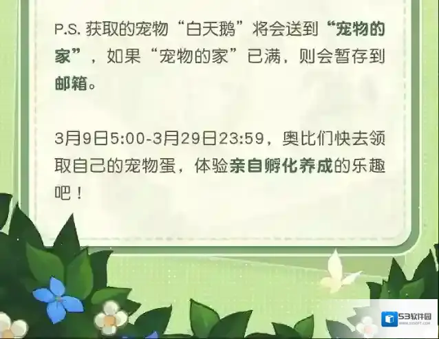 “叮咚!您有一颗可可爱爱的宠物蛋待领取~”本次1.9版本新增孵化养成玩法,是首个可以让奥比们通过自己孵化和养成,培养出变异宠物的玩法。3月9日5:00-3月29日23:59期间,奥比们可以点击「鱼之歌」活动图标,进入「海神之梦」活动界面,即可免费领取属于你的宠物蛋!通过消耗材料给宠物蛋补充养分、调控温度,就能孵化出一只呆萌的小宠物。继续培养宠物,还可以变异成最终形态“白天鹅”噢,奥比们快上线体验孵化养成的乐趣吧!