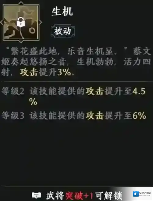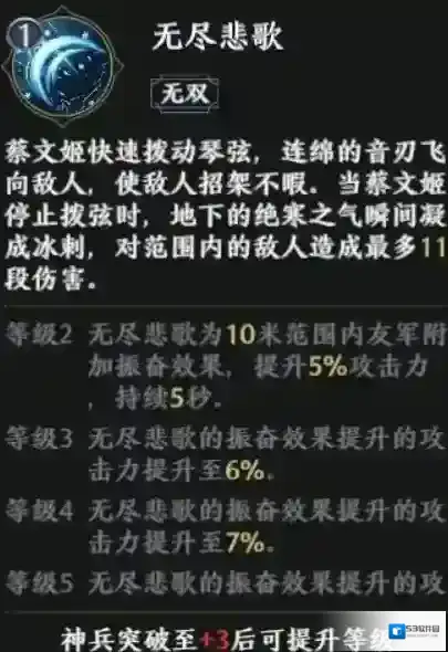 蔡文姬突破+1时解锁,为蔡文姬提供一定的攻击加成。这个天赋一定程度上弥补了蔡文姬的伤害量。