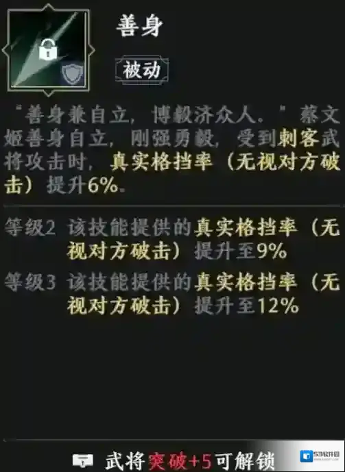 蔡文姬突破+5时解锁,该天赋的效果为受到刺客武将攻击时,真实格挡率提升。降低了刺客武将对蔡文姬的威胁,增强了蔡文姬的生存能力。