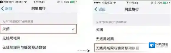 5.如果泡泡趴不存在此列表中,请选择列表中已有的任意一款应用,重新设置一次该应用的联网权限。以阿里旅行为例,将其联网权限设置为“关”后,再设置为“无线局域网与蜂窝移动”