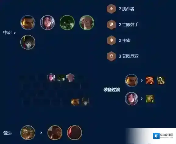 2阶段以3艾欧为中心,补沃里克开2主宰2挑战,后排找个长手AD单位带装备,优选2星莎弥拉>2星烬>2星崔丝塔娜