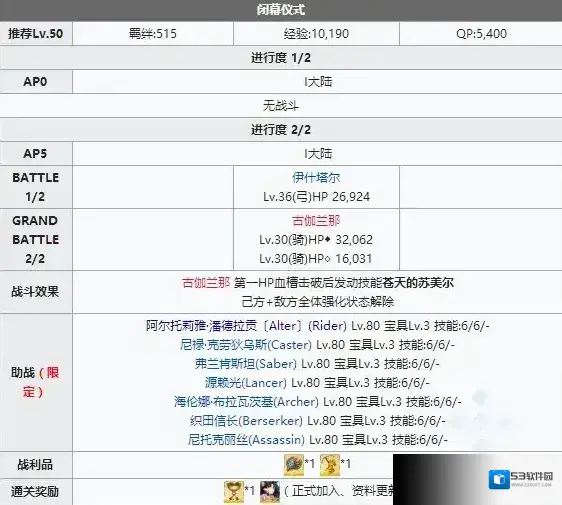 fgo1.5.3主线第5节配置 下总国第5节怎么打 下总国活动:fgo亚种特异点3攻略大全 5-1 这一关就只有狂阶的清姬和术阶的玉藻前,可以先杀清姬,再打玉藻前。 FGO下总国 5-2 纯剧情,无战斗 5-3 都是杀阶的敌人,可以上术阶的尼禄,光炮...2025-09-08 -