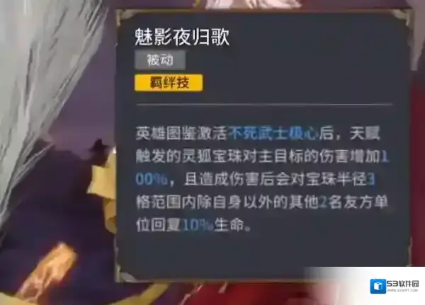 如果你激活了与极心的羁绊技“魅影夜归歌”,那优璃的天赋技能将进一步提升伤害,灵狐宝珠所造成的伤害会提升至100%。同时,技能释放后,她还会为周围的2名友方单位回复10%的生命值,这个效果不仅加强了优璃的输出,也为队友提供了生存保障,让队友们能够安心在队伍里持续战斗。这样玩家可以在这个队伍阵容当中,发挥出更强大的实力,从而保证队伍的有效输出,绝不会拖累队伍。