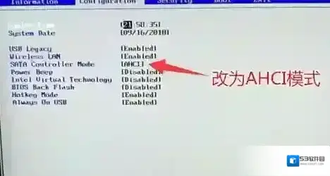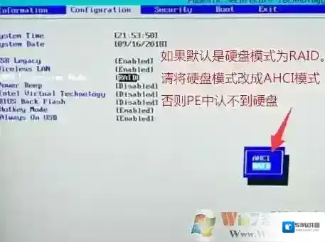 6、注意:再返回configuration这项,查看sata controller mode这项,如果默认硬盘模式为RAID,请将硬盘模式改为AHCI模式,否则进PE后不能认出硬盘,如果更改后记得按F10保存,如下图所示;