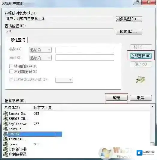 5.在“选择用户或组”高级选项里点击“立即查找”按钮,然后找到“SYSTEM”,然后点击确定即可。