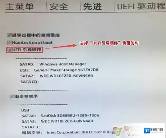 6、进入后将UEFI顺序前面的勾去掉,让机器默认为传统启动,这样方便安装WIN7,如图: