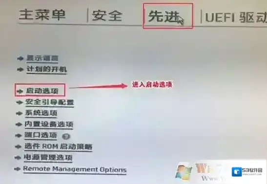 5、F10保存重启后再次开机按ESC,然后选择F10进入BIOS设置,将鼠标移动“先进”选项中,选择”启动选项”后回车进入,见下图: