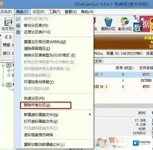 2、打开桌面上的Diskgenius分区工具(DG分区工具);打开Diskgenius后,选择笔记本硬盘,然后点击“硬盘”,查看菜单中的“转换分区表类型为MBR格式”选项是否灰色,如果是灰色的话那么我们就无需进行重新分区,除了C盘系统盘和桌面上的资料,重装系统后其他磁盘中的资料都不会被清空,如果“转换分区表类型为MBR格式”选项是可选的,则需要将整个硬盘格式化,操作方法如下:删除分区:点击“硬盘”–“删除所有分区”,删除前确保资料已经转移,删除后,点击保存更改,如图: