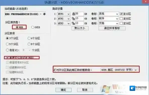 重新分区:磁盘格式转换完成后,点击快速分区,勾选 分区表类型为 MbR ,勾选了重建主引导记录MBR,选择需要分区的个数以及大小,当然大家可以点击“自定”来设置合适的分区,按下确定后开始分区(如果是固态硬盘或者是东芝的硬盘要进行4K对齐一下),如下图: