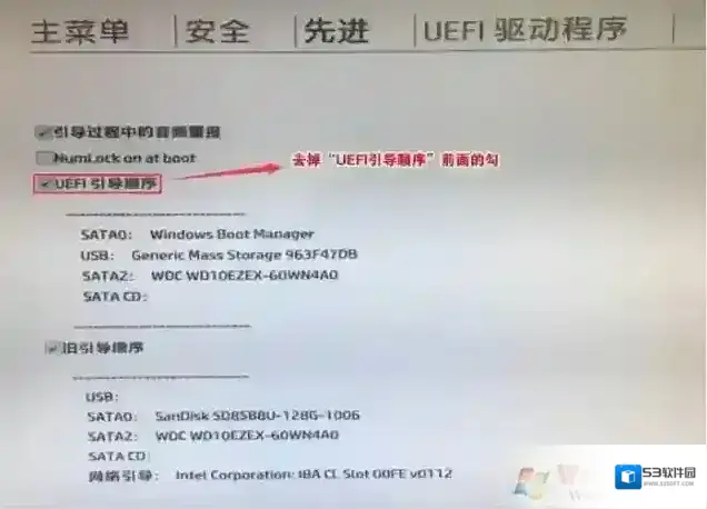 6、进入后将UEFI顺序前面的勾去掉,让机器默认为传统启动,这样方便安装WIN7,如下图所示;
