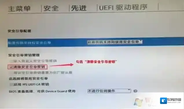 4、F10保存重启后再次开机按ESC,然后选择F10进入BIOS设置,将进入刚设置的地方,勾选“清除安全引导密钥”,然后再次F10保存;