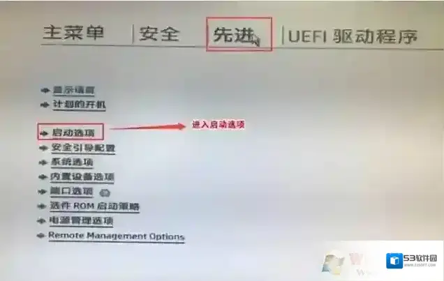 5、F10保存重启后再次开机按ESC,然后选择F10进入BIOS设置,将鼠标移动“先进”选项中,选择”启动选项”后回车进入,如下图所示;