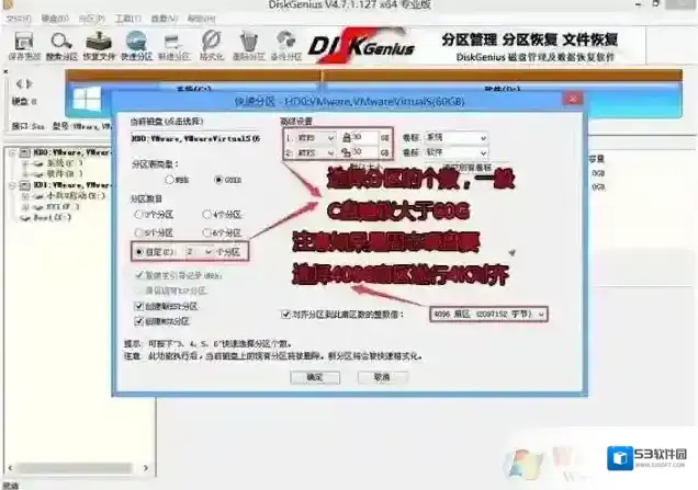 3、在弹出的快速分区界面,我们这里选择好分区的类型GUID和分区的个数以及大小,这里一般推荐C盘大小大于60G比较好,然后注意如果是固态硬盘要进行4K对齐,如下图所示;