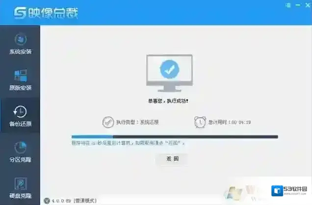 4、还原分区结束后,“自动倒计时10秒重启“或选择“返回”不重启。