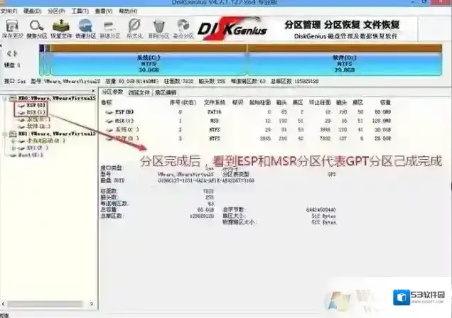 4、分区完成后可以看到ESP和MSR分区代表GPT分区完成,如下图所示;