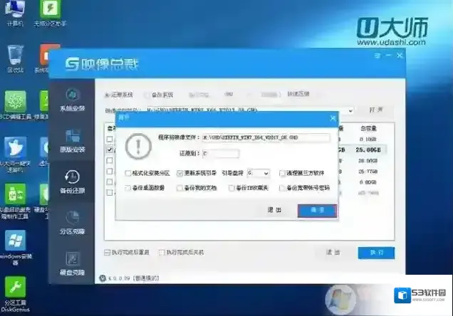 2、点击“执行”后默认不用选择,然后直接确定,电脑进入win10解压,此操作时间不长,请不要离开电脑,以便下一步重要操作。