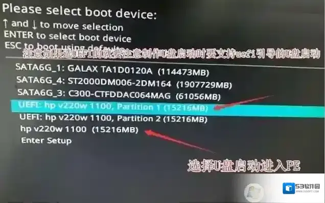 5、把刚制作好的U盘启动盘插入到机器上,重启按ESC选择识别到U盘启动项,回车;