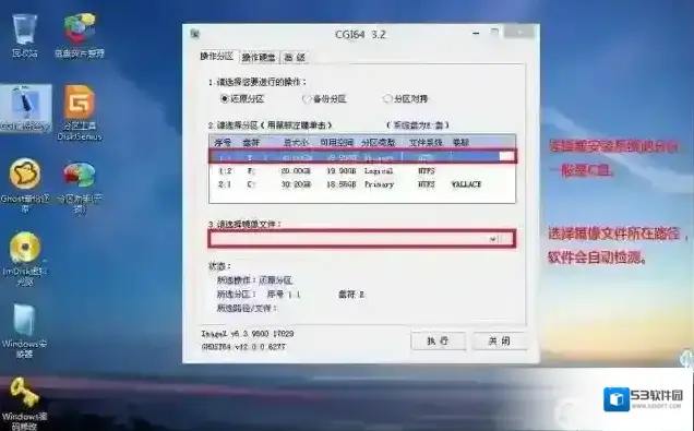 2、过劲行CGI备份还原,找到你的Win7或Win10系统安装镜象,然后安装到C盘就可以了!