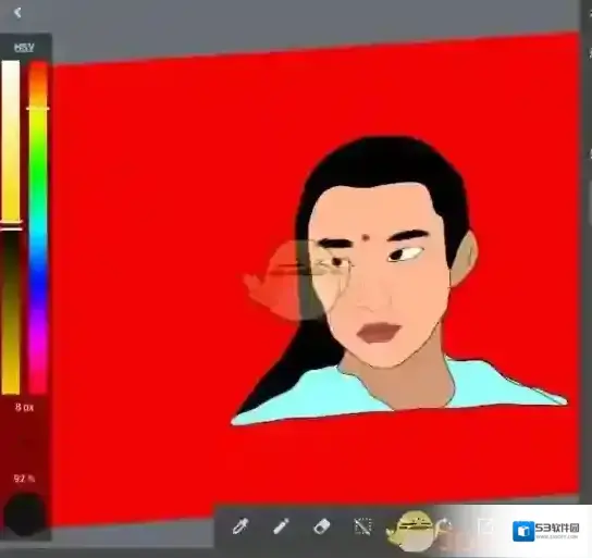 6、将导入的图片图层删除,将人物的头发填充为黑色,背景填充改为红色,接着再绘制出人物的五官就可以了。