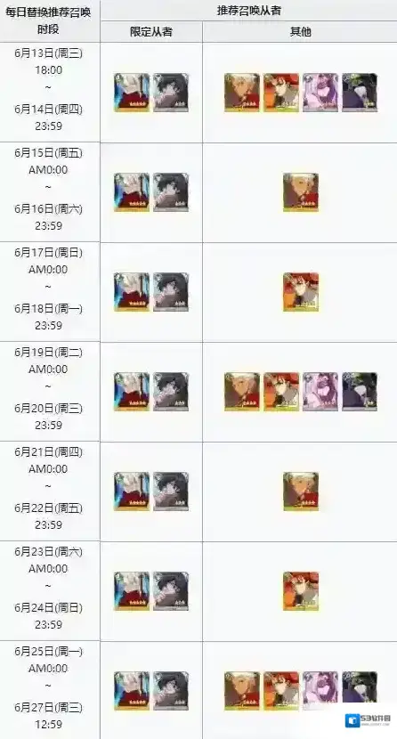 ‘4(SR)卫宫(Archer)’ ‘4(SR)神枪 李书文’ ‘3(R)美杜莎(Rider)’ ‘3(R)美狄亚’将以每日替换的方式推荐召唤,