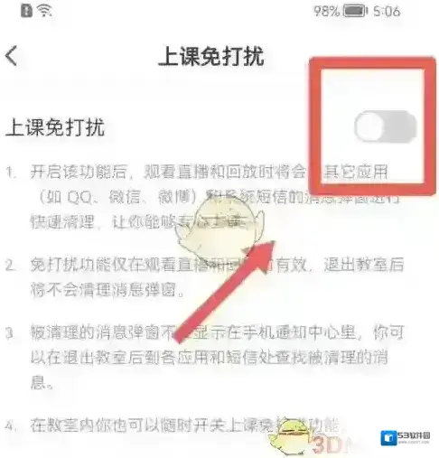 4、进入上课免打扰界面中,点击开启上课免打扰右侧开关即可。
