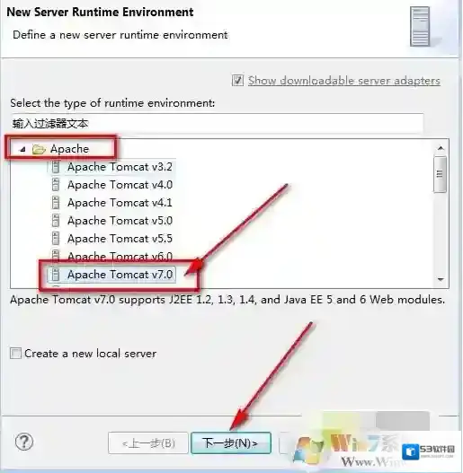 6、然后点开“Apache”文件夹,在下面选择其中一种Tomcat,这里我就选择“Apache Tomcatv7.0”,然后点击“下一步”。