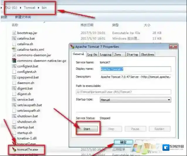最后来到找到Tomcat的bin文件目录下的“tomcat7w.exe”,双击运行它,然后点击“start”,然后点击确定就可以了。