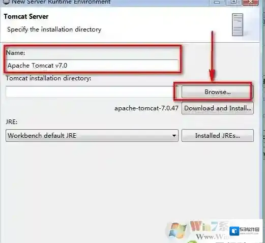 7、如图,使用默认的名字,然后点击“Browser”,来配置Tomcat的安装位置。
