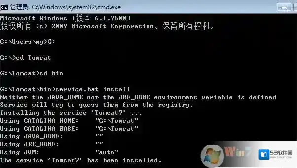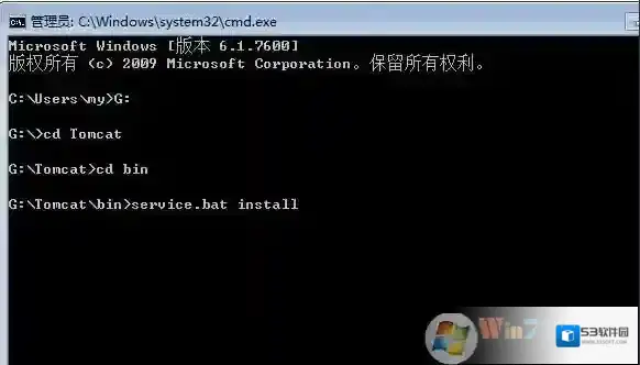 13、下载安装之后,还需要运行cmd命令进行配置。如图,进入G:Tomcatbin目录下,进入方法如下。如图,在cmd命令模式下输入G: 然后回车。再输入cd Tomcat 回车再输入cd bin 回车再输入service.bat install 回车。注意目录要相应改变哦。