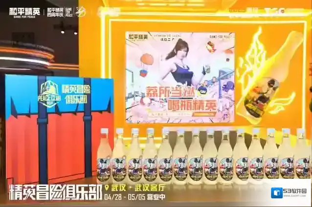 本次「精英冒险俱乐部」-空投吧台的打造也充满了小惊喜,在代表着惊喜和幸运的巨型空投下方等候着玩家们的到来!《和平精英》吉莉的燃力海报、燃烧瓶造型打造的巨型瓶身、陈列满墙的联名汽水……让这里成为玩家们集合碰杯、共享潮流社交乐趣的集合地!