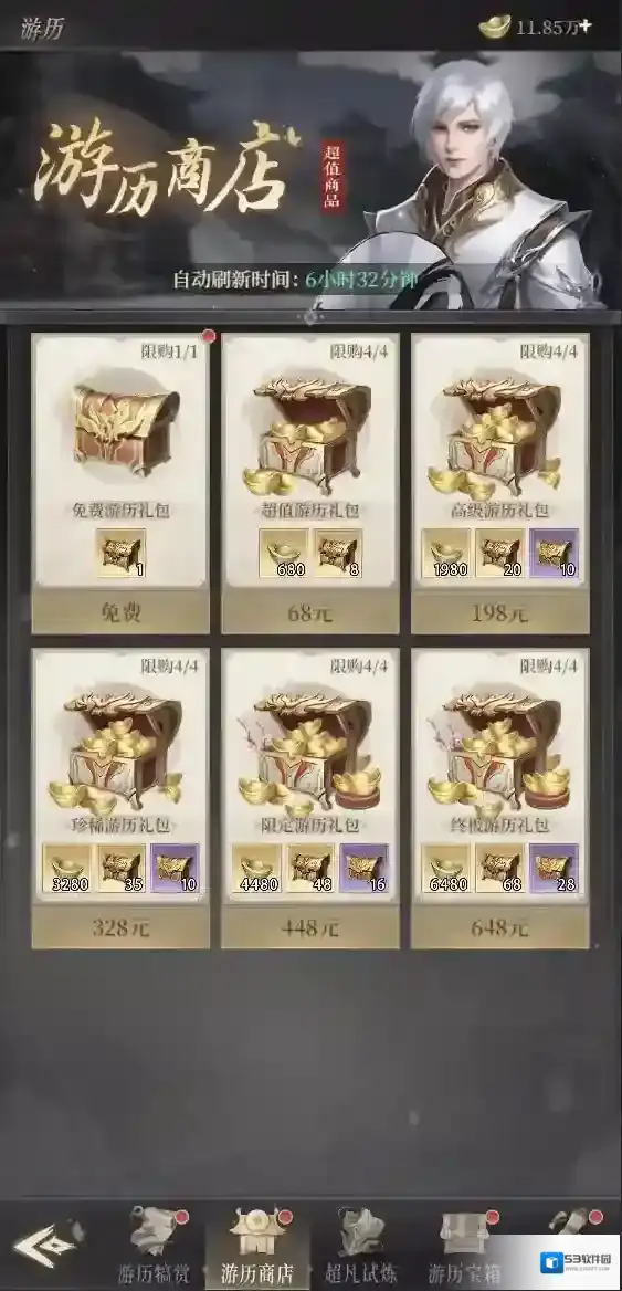 2、少侠可以通过购买游历礼包,获取游历宝箱和元宝。
