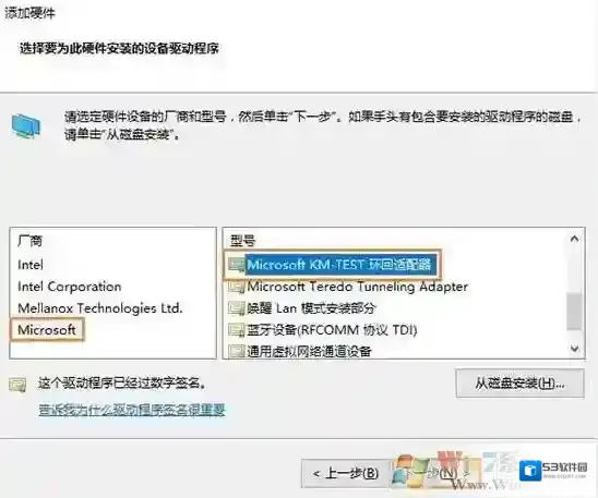 5、可能需要稍等一两秒,然后在左侧选择“Microsoft”,右侧选择“Microsoft KM-TEST Loopback Adaptor(中文名为:环回适配器)”,点击“下一步”;