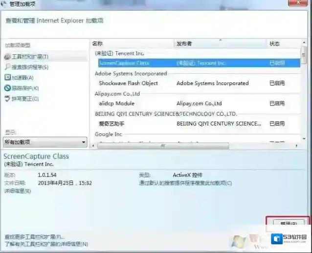 3、打开加载项管理后,把一些不需要的加载项禁用即可;(加载项一般都有说明和发布者,我们从这些上面可以看出这些加载项是否有用,没用的一律禁用)