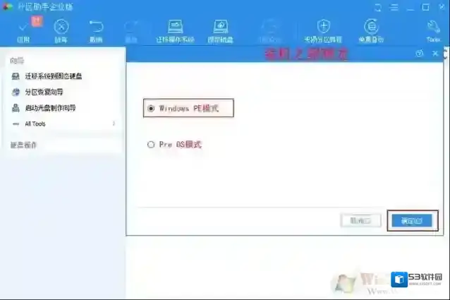 7、有两个选择,这里我没有显示出来,我已经标注了,一共有两个模式,分为Windows PE模式和Pre OS模式,默认选择的是第一种,如果你的电脑有磁盘阵列的话,就要选择第二种Pre OS模式。