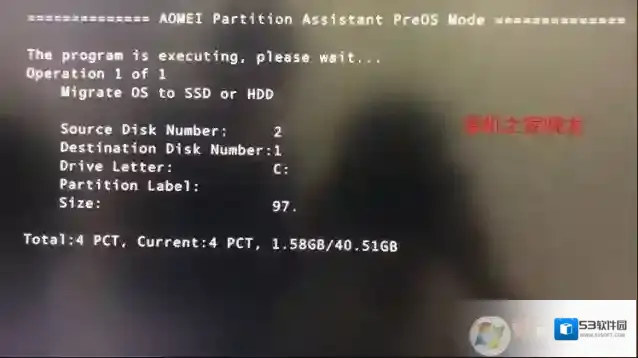 9、之后系统会重新启动,进入到系统迁移的步骤,这一步在PE下运行,所有可以完美的复制一个系统到新硬盘。