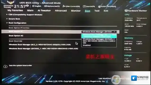 11、在Boot选项卡中找到第一启动项,例如Boot Option#1,选择固态硬盘为第一启动项,如下图所示。由于我电脑是UEFI启动方式+GPT格式硬盘,所以需要选择Windows Boot Manager开头的固态硬盘型号。