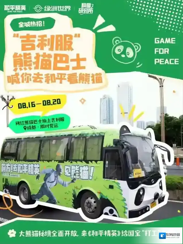8月16日-8月20日,《和平精英》“吉利服”版熊猫巴士也将空投成都市,全城热招新玩法“绿洲世界·大熊猫秘境”的特别”打工人”。来成都春熙路必打卡的熊猫巴士,从巨型空投箱中破次元而出!邀请你解锁和平“圆”宇宙这份令人心动的特别OFFER,前往和平精英给国宝熊猫“打工”,成为“国宝守护者”;更有身披“吉利服”的限时装扮营业熊猫巴士全城穿梭,给你“种草”这份和平「圆宇宙」的理想岗位!