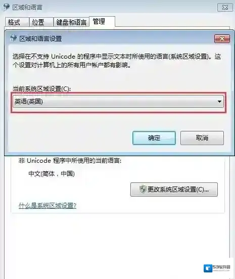 4、在区域和语言窗口中,点击“管理”,然后找到“非Unicode程序的语言”,点击“更改系统区域设置”;