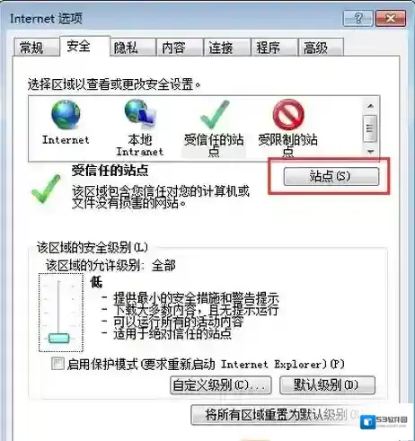 3、重置完成后,点击“安全”选卡,然后点击下方的“受信任的站点”,将“该区域的允许级别”滑动条拉至最底部,然后把“启用保护模式”复选款的勾去掉;