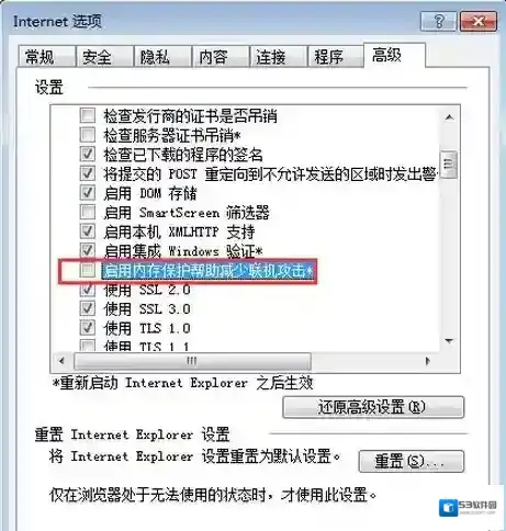 5、在“Internet 选项”窗口点击“高级”选卡,在下方设置框内,找到“启用内存保护帮助减少联机攻击”的勾去掉,然后点击应用并确定;