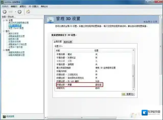 在管理3d设置中将小编标出来的功能关闭,然后把纹理调到高性能模式