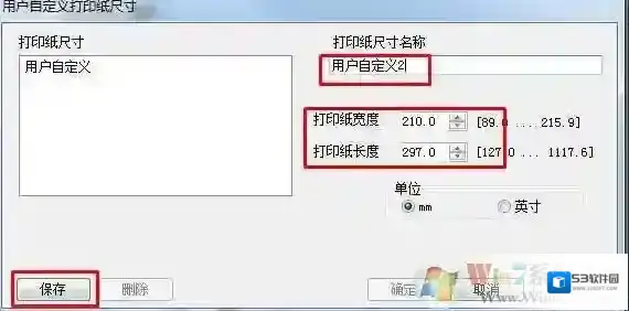 3、然后设置纸张大小,名称,点击保存就可以了~ 并在打印机首选项是设置该纸张大小即可。