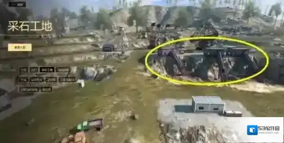烈日当空照大地,远观尽是汗淋漓。采石工地地形呈梯状层次分布,物资主要集中在内部的低处,房屋机构简易,很符合现实,存在很多机器掩体,不适合作为物资搜集区。上图黄圈内三个采石运输房,内部可观察四方,掩体全方位,窗户用于射击,躲进通道易守难攻,当然,要多注意房子上方高地的情况,注意躲避手雷轰炸即可。