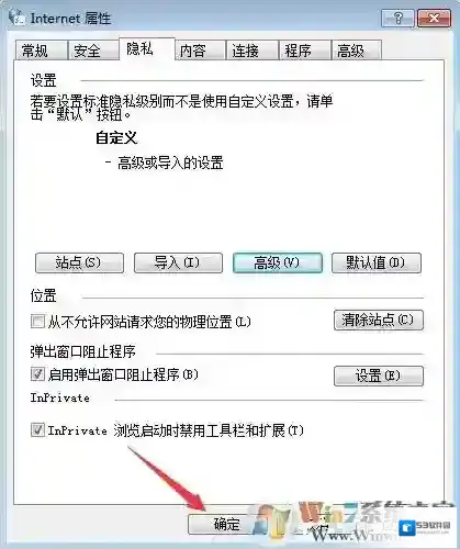 3、在弹出的Internet属性窗口,我们点击“隐私”,在隐私设置中我们点击“高级”;