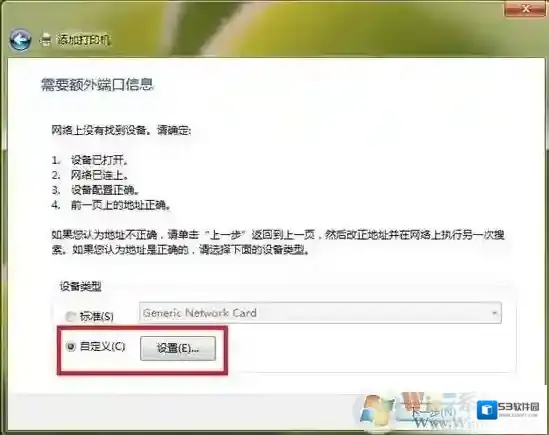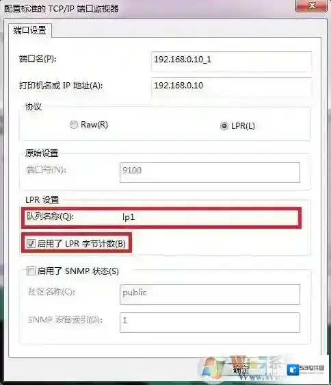 6.端口创建成功后,在下一界面的设备类型选择自定义并点击设置按钮,在弹出的页面中选择LPR协议,添入队列名称为lp1并勾选启用了LPR字节计数,点击确定按钮后继续选择下一步。